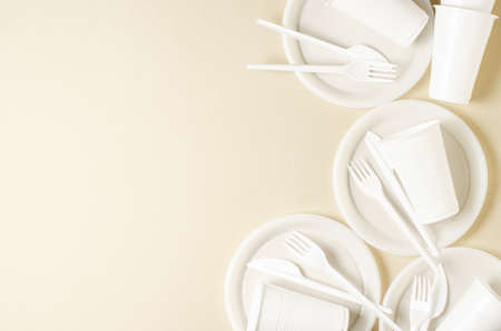 Disposable white plastic tableware on a beige background. The concept of nature pollution. Copy space.