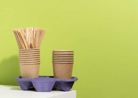stack of brown disposable paper cups and a stand on a white table, green background. Utensils for takeaway drinks, zero waste