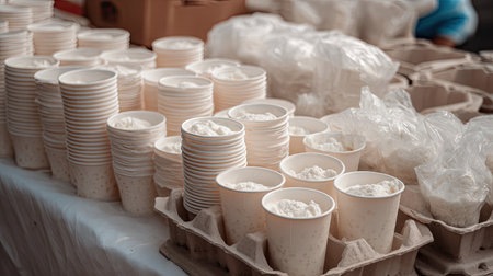 A vibrant scene showcasing a food market stall filled with creamy dessert cups alongside plastic packaging, highlighting local flavors and indulgent treats.