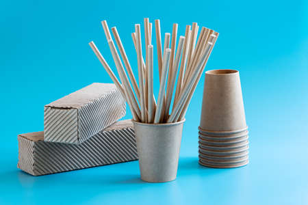 Zero waste and plastic free concept. Eco-friendly disposable craft paper cups, straws and packing boxes on blue background. Recycled paper tableware and packaging
