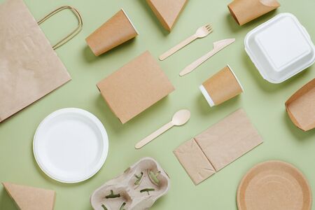 Set of different eco-friendly tableware and kraft paper food packaging on light green background. Street food paper packaging - cups, plates, straws, containers, paper bags, wooden cutlery