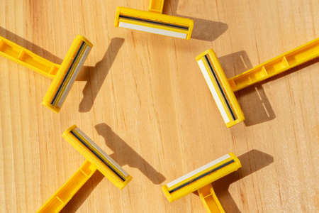 Many colored plastic razors on yellow background with blue pastel circle. Minimalistic beauty still life