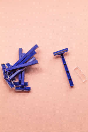 Beauty and fashion pop art concept. Many colored plastic razors on blue background. Minimalism