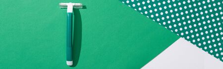 top view of green disposable razor on green and white dotted background, panoramic shot