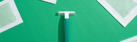 top view of green disposable razor and depilation wax stripes on green background, panoramic shot