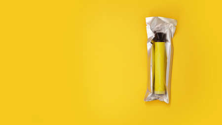 Yellow disposable electronic cigarette in female hand. Bright yellow background