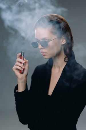 Young woman vaping electronic cigarette with sunglasses and black jacket surrounded by vapor smoke against dark background, expressing modern lifestyle and urban mood.