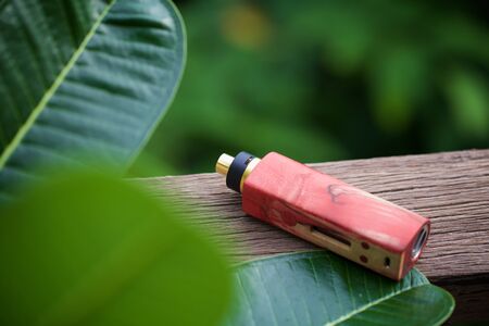 high end red natural stabilized wood box mods with rebuildable dripping atomizer on natural wood texture background, vaporizer equipment, selective focus