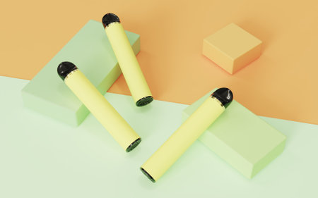 disposable electronic cigarettes with shadow on a yellow background with copy space. The concept of modern smoking, vaping and nicotine. top view