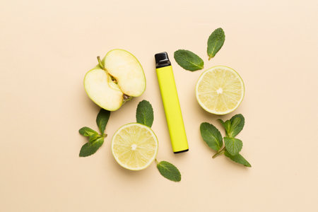 Disposable e-cigarettes on dark background top view, mocap. green orange