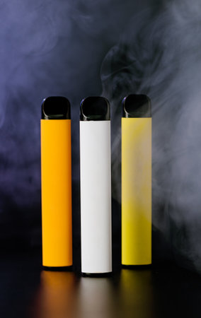 Colorful disposable electronic cigarettes on a black background with smoke. The concept of smoking, vaping and nicotine.