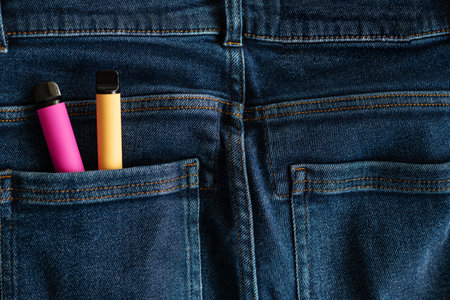 A set of multi-color disposable electronic cigarettes in a jeans pocket. The concept of modern smoking, vaping and nicotine.