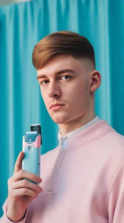 Serious attentive redhead man dresses for work irones outfit shaves simultaneously wakes up late dressed in formal shirt with tie poses against blue background Housework : Generative AI