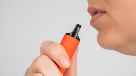 A young girl smokes disposable electronic cigarette. Bright yellow background