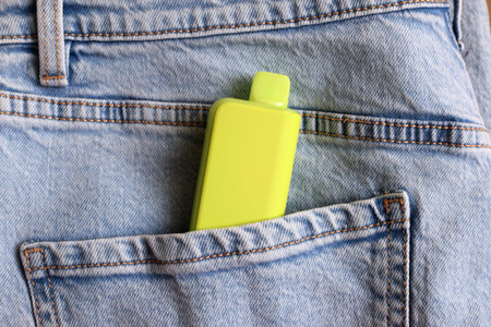One multi-colored electronic cigarette in the pocket of jeans. Vape with nicotine.