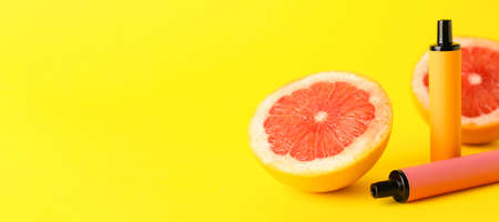 Modern electronic cigarettes and grapefruit on yellow background with space for text