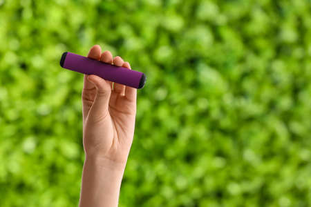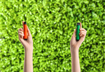 Female hands with disposable electronic cigarettes outdoors, closeup