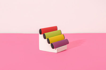Disposable single pink e-cigarettes with saline nicotine. Pod systems of different colors. Devices for quitting smoking. Red, yellow, green, pink. conceptual fashion photo. Lines and geometry
