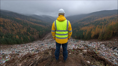 A worker in a high-visibility jacket observes a massive waste site in a forested area, emphasizing the urgent need for environmental conservation and clean-up efforts.