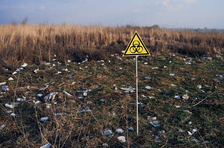 Yellow triangle with biohazard symbol warning on abandoned territory with trash. Garbage waste field with biological hazard sign. Concept of ecology, environmental pollution and danger.