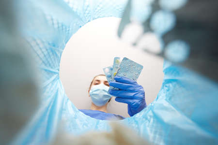 Hand in blue gloves puts plastic bottle in recycling bin. Environment care, sorting waste. Copy space. New normal life after coronavirus pandemic quarantine. Recycling, zero waste, ecology concept