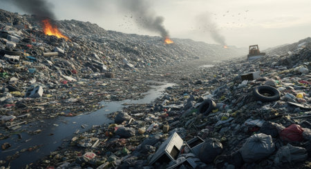 A sprawling landfill scene with burning waste, emitting plumes of dark smoke into the hazy atmosphere.