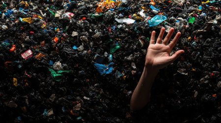 A hand reaches out from a pile of recycled trash, symbolizing environmental pollution, the struggle for clean resources, and recycling