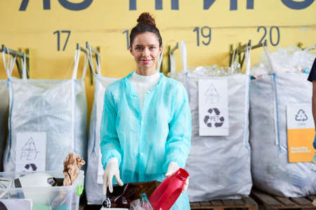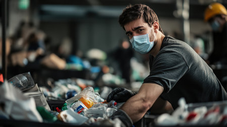 Worker in recycling plant for sorting deposit and plastic bottles background. AI Generated.