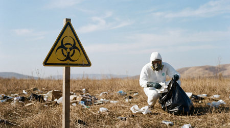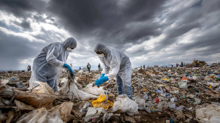 A man wearing a protective suit and a mask collecting garbage from a landfill
