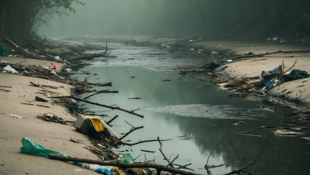 Extremely polluted defocused banks of river and huge amount of garbage. AI generative illustration.