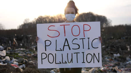 Sad woman volunteer activist stands at big landfill site with garbage with Stop Plastic Pollution poster demonstrates against protection environment. Pollution and ecology.