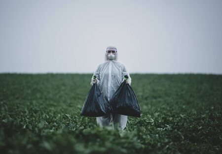 Ecologist wearing white protective coverall, gas mask, collecting plastic garbage into black waste bag outdoors on a sunny day in spring, biohazard sign on foreground. Concept of ecology