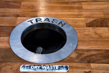 Closeup of a plastic garbage bin at the Pashupatinath temple in the morning