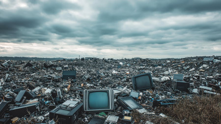 A sprawling electronic waste dump in an open area, filled with broken gadgets and appliances under a gloomy cloudy sky. No people.