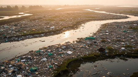 An aerial view captures a river winding through a landscape heavily contaminated with widespread plastic waste and debris under a hazy sunset.