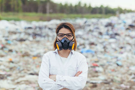 Female scientist in a protective respirator mask at a landfill assesses the level of environmental pollution