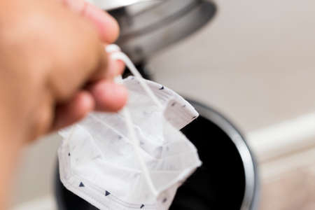 Cropped person's hand throw the mask in the trash bag. To show lift a requirement for people to wear masks outdoors as a measure against the coronavirus