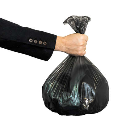 a black garbage bag in a man's hand is isolated on a white background.