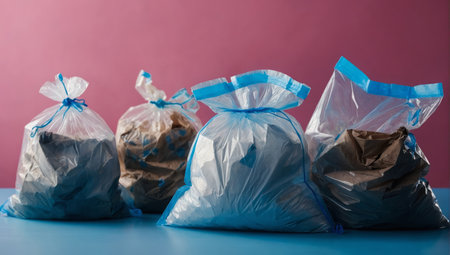 Four tied black garbage bags are neatly lined up against a white background, illustrating waste management and cleanliness in a household or urban setting.