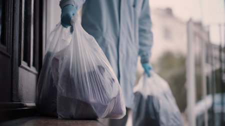 Medium shot of a professional collecting laundry bags at a customers doorstep showcasing convenient doortodoor wash and fold service for busy households.