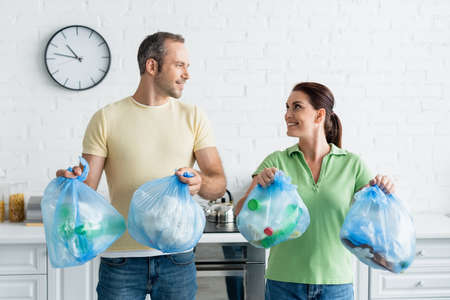 Smiling couple looking at each other while holding trash bags in kitchen