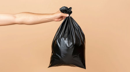 A hand holds a tied black plastic garbage bag, symbolizing waste disposal and recycling efforts. Ideal for concepts of cleanliness and sustainability.