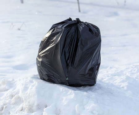 Black bag with garbage on the snow in winter.
