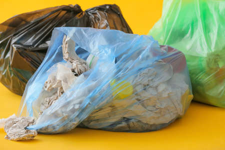 Trash bag full of garbage on yellow background