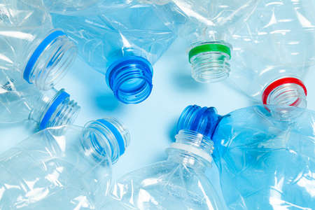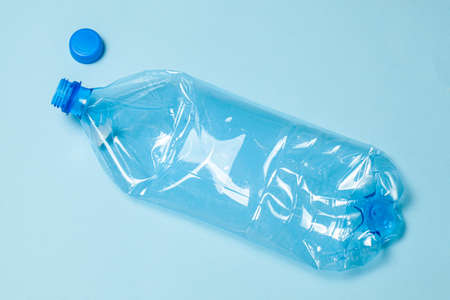 Crumpled plastic bottles on a blue background. Plastic trash.