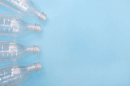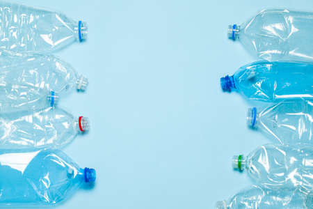 Plastic bottles on blue background with place for text. Against the use of plastic. Recycling. Ecology problem, environmental pollution. Copy space.