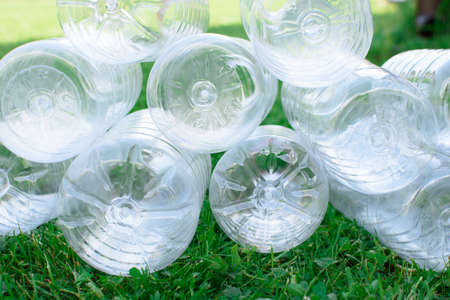 Bottoms of used plastic bottles on the grass, the concept of ecology. Waste separation concept.