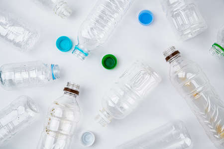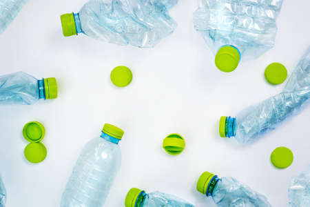 Flat lay plastic bottles and caps on white background