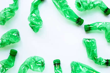 Sorted plastic green bottle for recycling and waste sorting and white background with copy space for your text. Eco-friendly habits for modern lifestyle concept