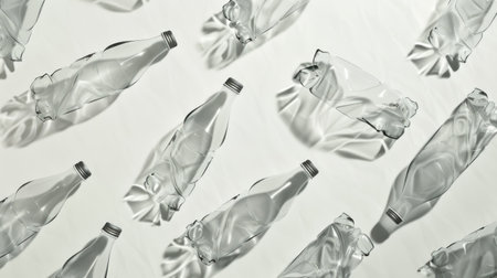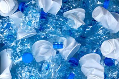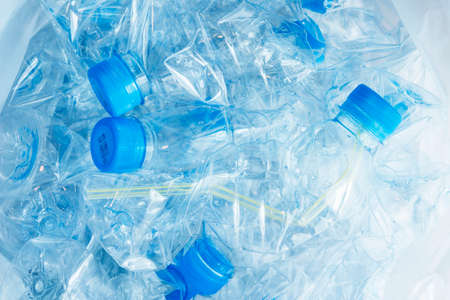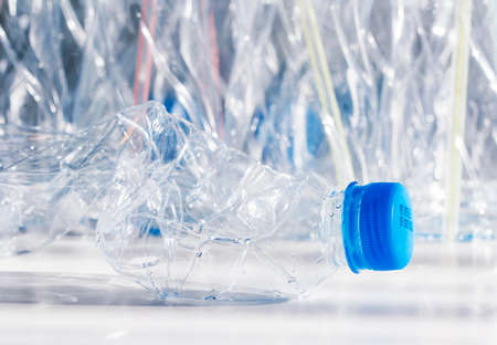 Crushed or crumpled clear plastic bottles. Plastic waste. Plastic recycling. Plastic pollution and waste management.